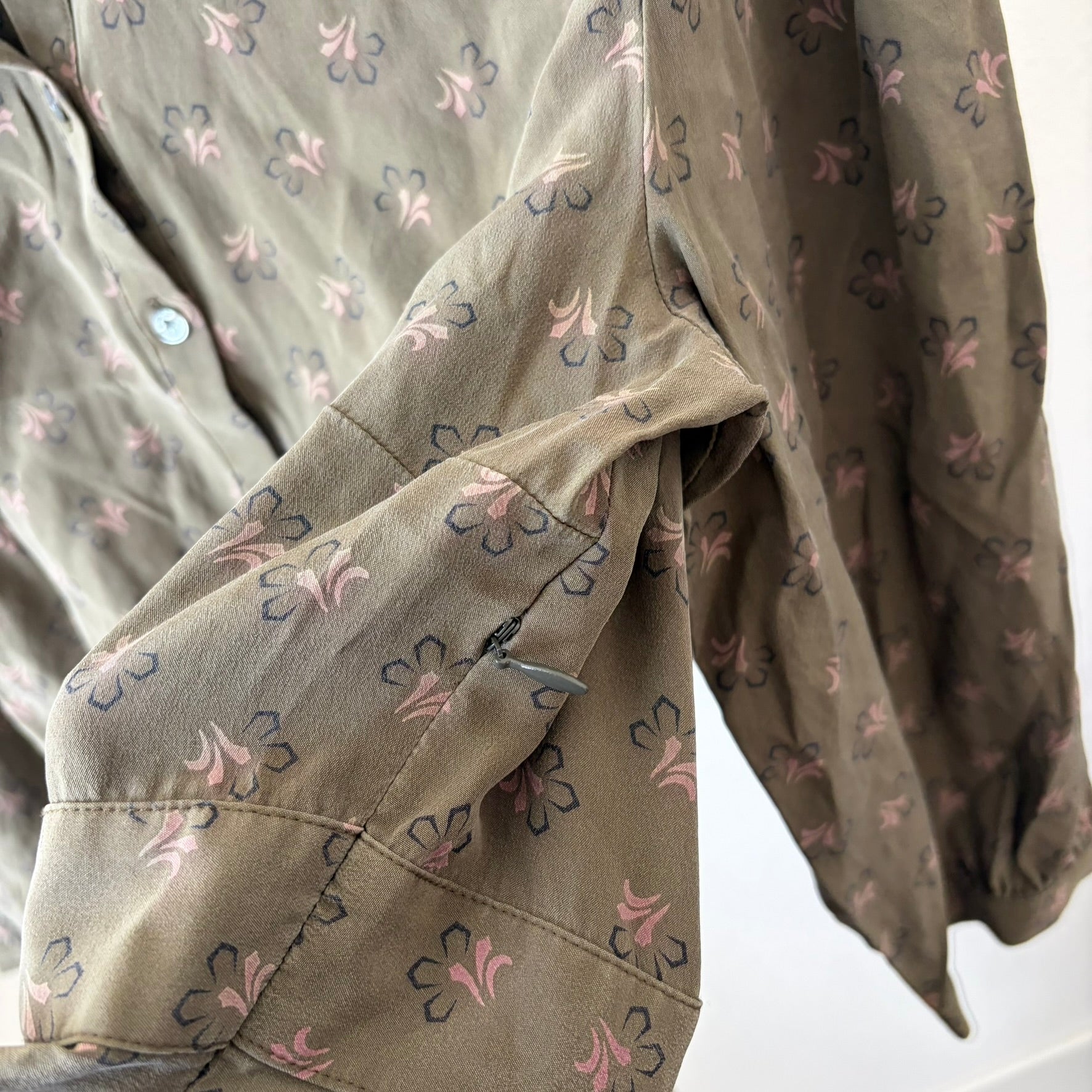 Sundance Dress 14 Olive Green Floral Silk Button Front Puff Sleeve Pleated Midi