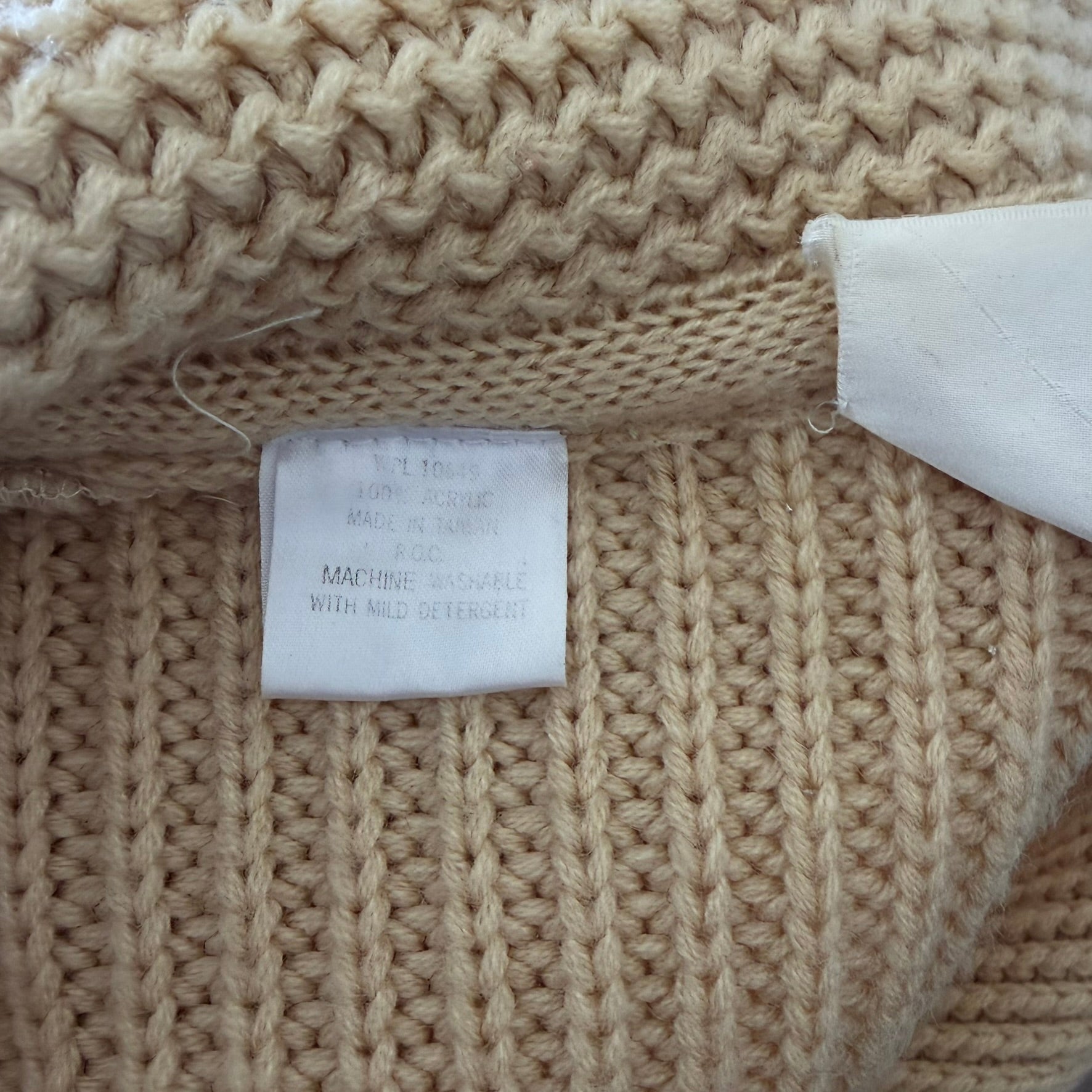 - Details: Heavyweight wool blend, button front, shawl collar, and hand-knit texture.